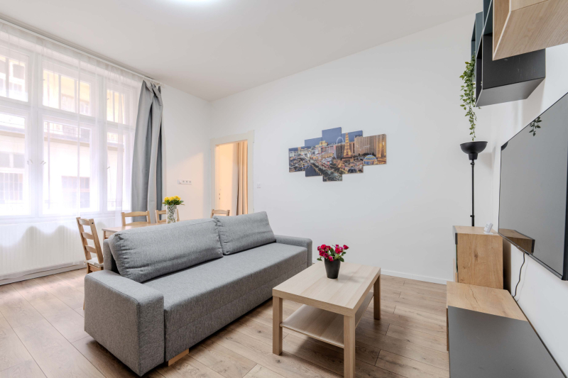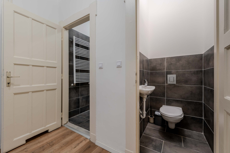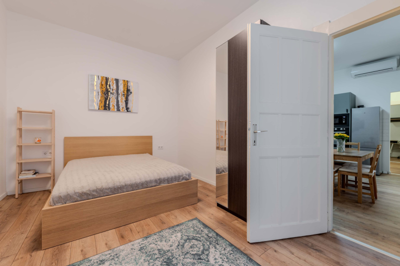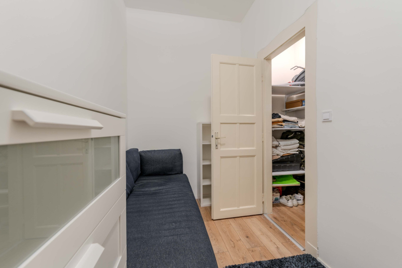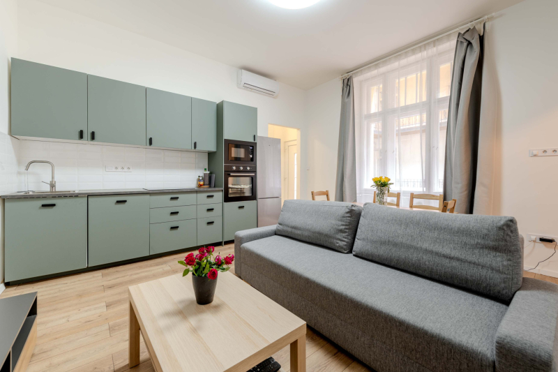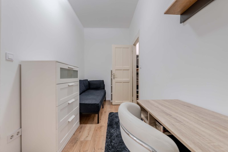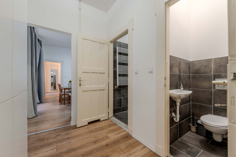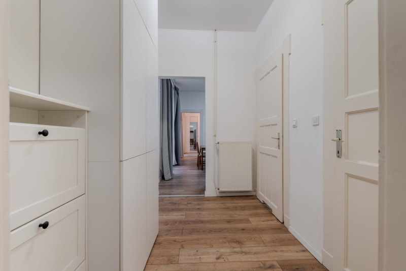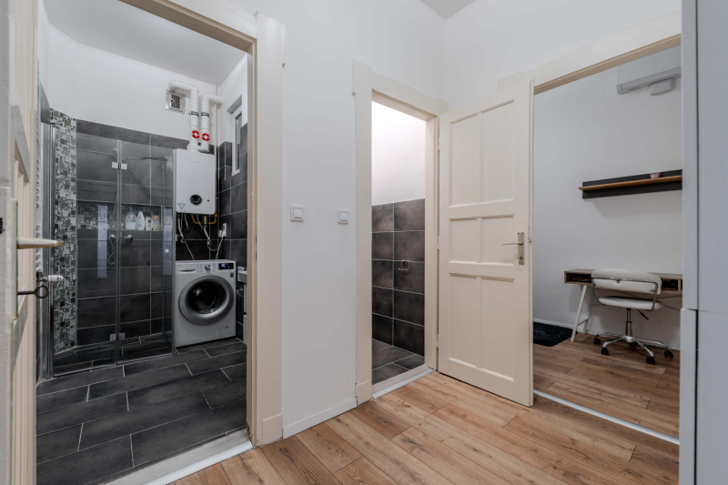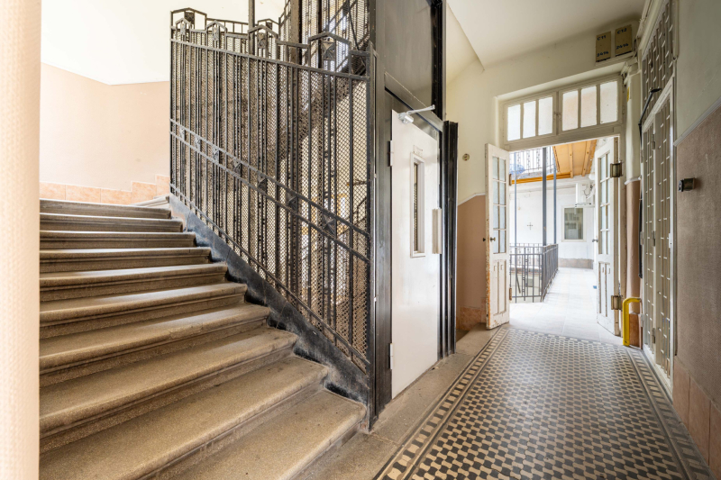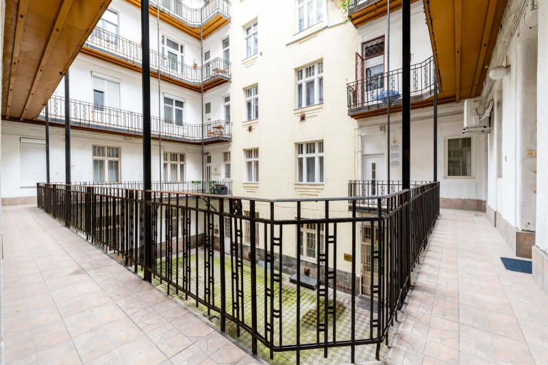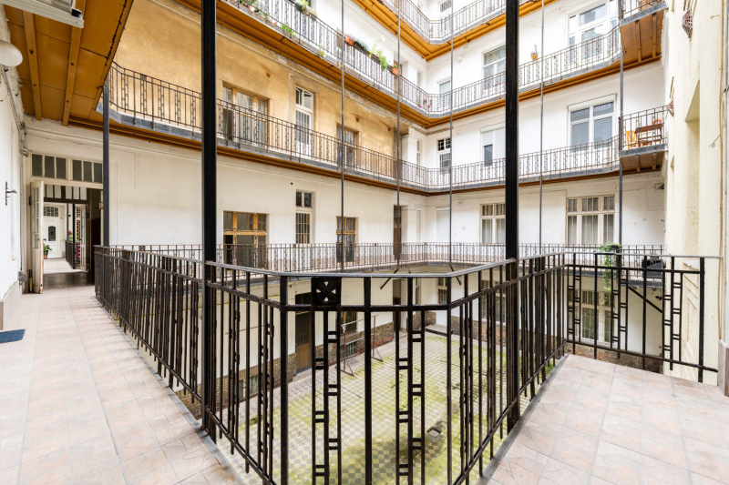 A lakás egy gyönyörű polgári házban található, melyet a nagy belmagasság és a tágas terek jellemeznek.