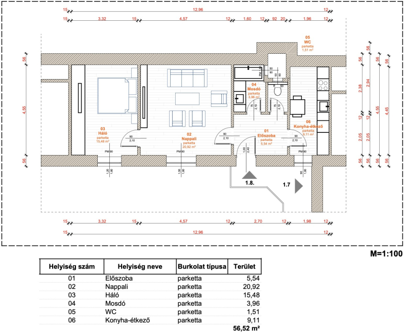 Optimális Elosztás: Bár csak 58 nm-es, a tágas terek és a nagy belmagasság lehetővé tették a rendkívül praktikus, 3 szobás kialakítást (amerikai konyhás nappali + 2 külön nyíló szoba), ideális elrendezés fiatal párnak, kis családnak vagy kiadásra.