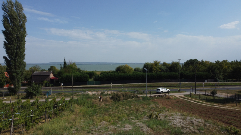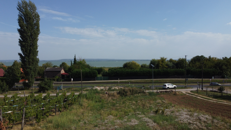 A Balaton víztükre már a telek alsó részén is látható, de a majdani épület felső szintjéről zavartalan panoráma nyílik majd, ezt drónfotókkal tudjuk láttatni.