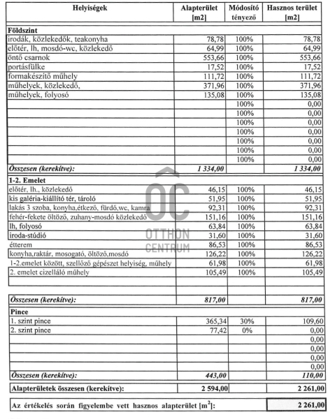 Pince 200 m2, földszint 1100 m2, I. emelet 1100 m2, II. emelet 100 m2.