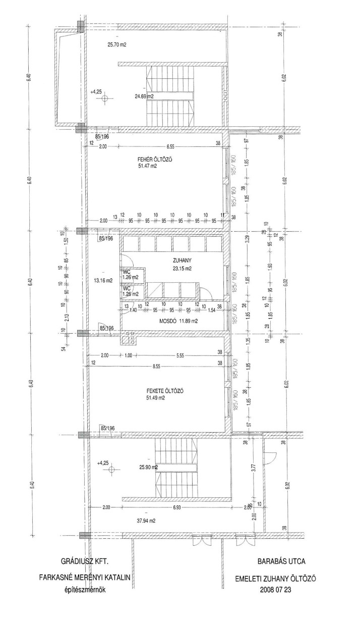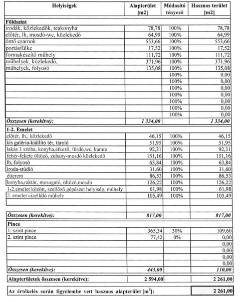 Pince 200 m2, földszint 1100 m2, I. emelet 1100 m2, II. emelet 100 m2.