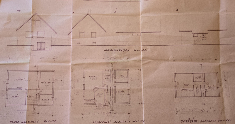 Földszint (100 m²): nappali, konyha-étkező, kamra, két hálószoba és egy félszoba, fürdőszoba, külön WC.