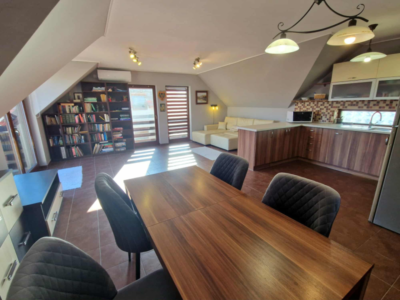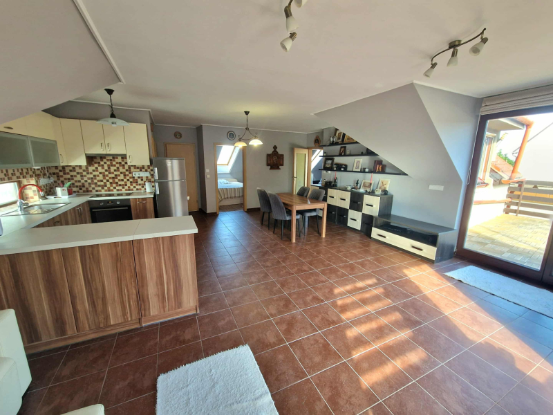 Az ingatlan három külön nyíló hálószobával és egy tágas amerikai konyhás nappalival rendelkezik. Az elosztása kiváló, hiszen minden szoba önállóan megközelíthető. A nappaliból egy 15 nm-es erkélyre léphetünk ki, ahonnan gyönyörű kilátás nyílik a Kálvária-dombra.
