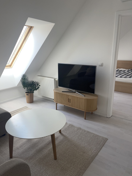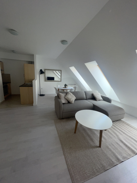 Hosszútávra kiadó ez a nappali plusz hálószobás tetőtéri KLIMATIZÁLT újszerű lakás KIVÁLÓ állapotban a Holló utcában a GOZSDU udvarban