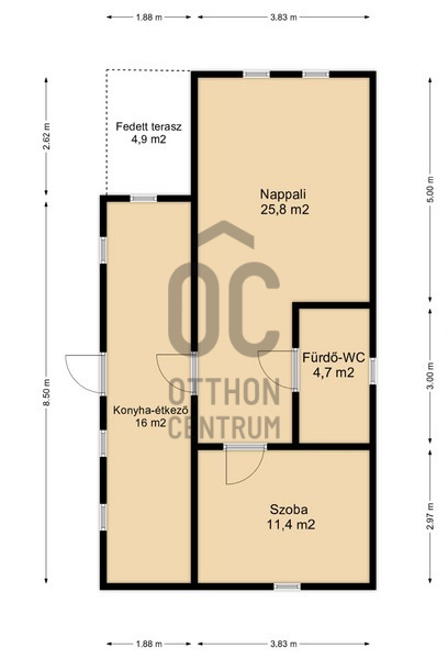 - Helyiségei: 2 szoba, étkező- konyha, fürdőszoba-WC, fedett terasz.