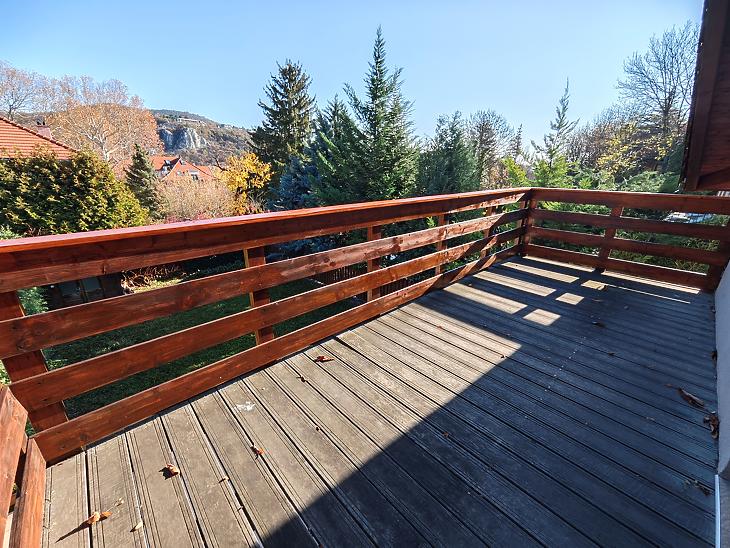 • Emelet: 3 szoba, 1 konyha, 1 gardrób, 2 fürdőszoba, 1 külön wc található. A nagy szobából nyílik egy 9,96nm-es erkély, amely hátsó kertre néz és gyönyörű kilátást biztosít az Apáthy-sziklára