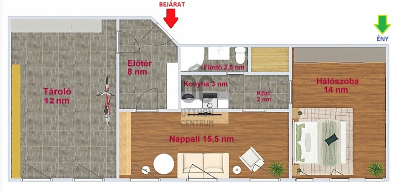 - 45 m2-es alapterületén belül 2 db külön nyíló egész szobával (15,5 m2 és 14 m2), egy konyhával (3 m2) és mögötte egy légtérben lévő (2 m2-es) kis közlekedővel, egy zuhanyzóval és WC-vel is ellátott (2,5 m2) fürdőszobával, valamint a lépcsőházból zárt ajtó mögött nyíló, tágas méretű (8 m2) előtérrel / előszobával rendelkezik, amelyből - a tulajdoni lapon már nem szereplő - további 12 m2 alapterületű tárolóhelyiség használatának a lehetősége is hozzátartozik, mivel ehhez a helyiséghez más lakónak nincsen kulcsa, így az - a megelőző 9 évben is – csak és kizárólag az eladásra kínált ingatlan mostani tulajdonosának a teljes mértékű, saját használatában volt,