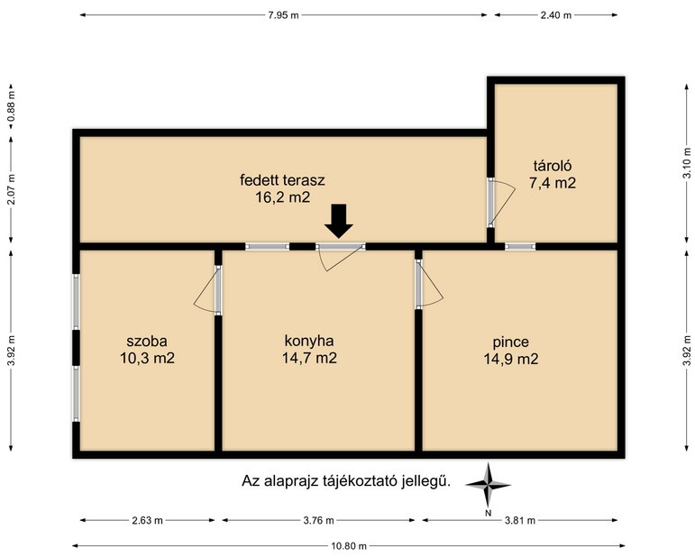 - az egy szintes épület helyiségei: hálószoba, konyha-étkező, borospince, tároló és terasz /16,2 m2/ össz. nettó 47 m2 alapterülettel