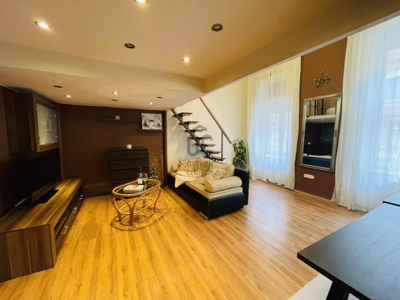 A lakás 44m² alapterületű, 395 cm-es belmagassággal, ahol helyet kapott egy 10m²-es álló galéria is.