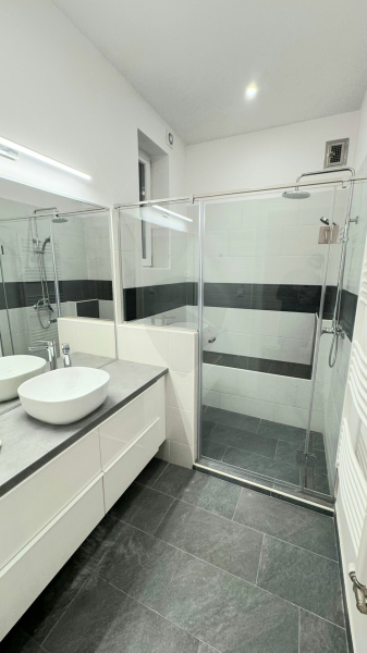 A fürdőszoba tágas hatalmas épített zuhannyal 2 mosdóval felszerelve, igényesen burkolva.