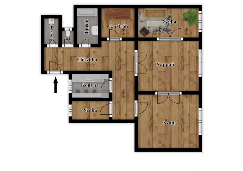 Ami még előnye, hogy a konyha és előszoba fal igény szerint kivehető, így még nagyobb és tágasabb konyha étkezőt alakíthatunk ki. De jelenlegi formája is praktikus és élhető belsőt ad.