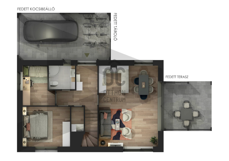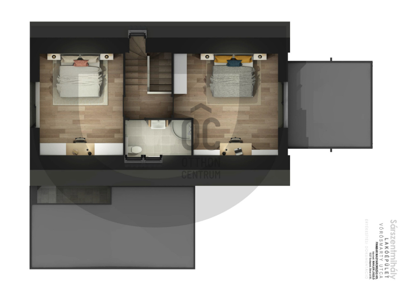 Az ingatlanon belül három hálószoba biztosítja az elszeparált életteret. Mindkét szinten külön fürdőszoba kerül kialakításra.