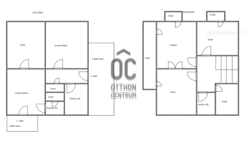 - Földszint: nappali, hálószoba, konyha, fürdőszoba+wc, előszoba, közlekedő