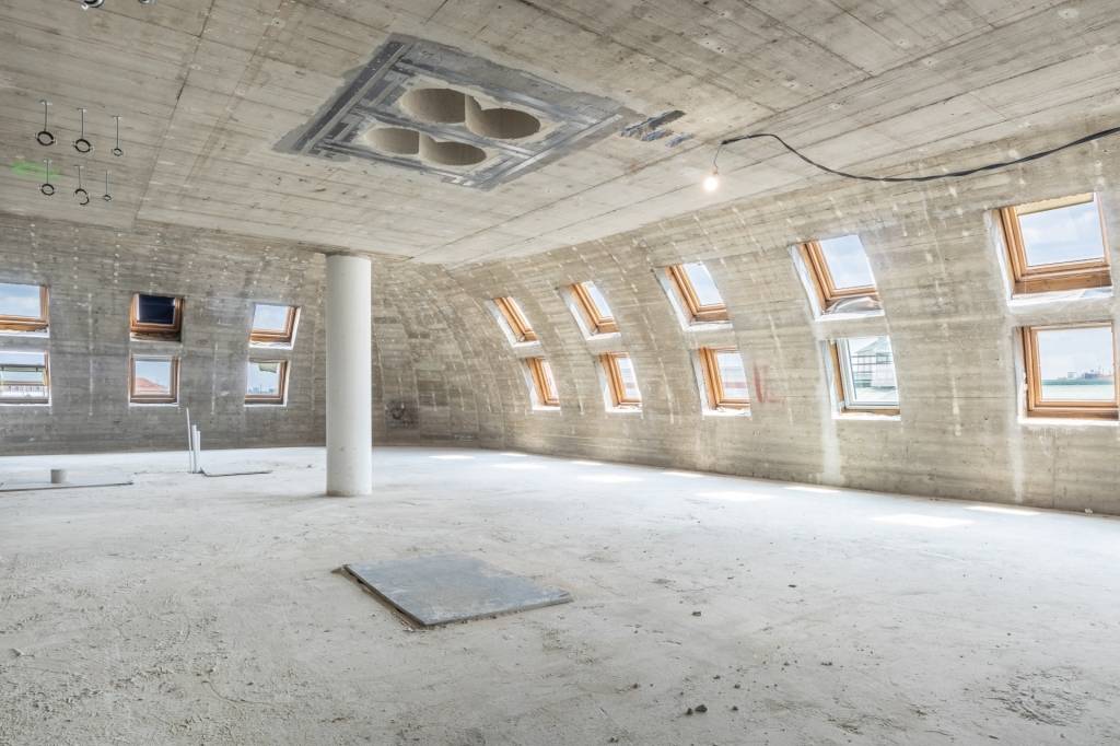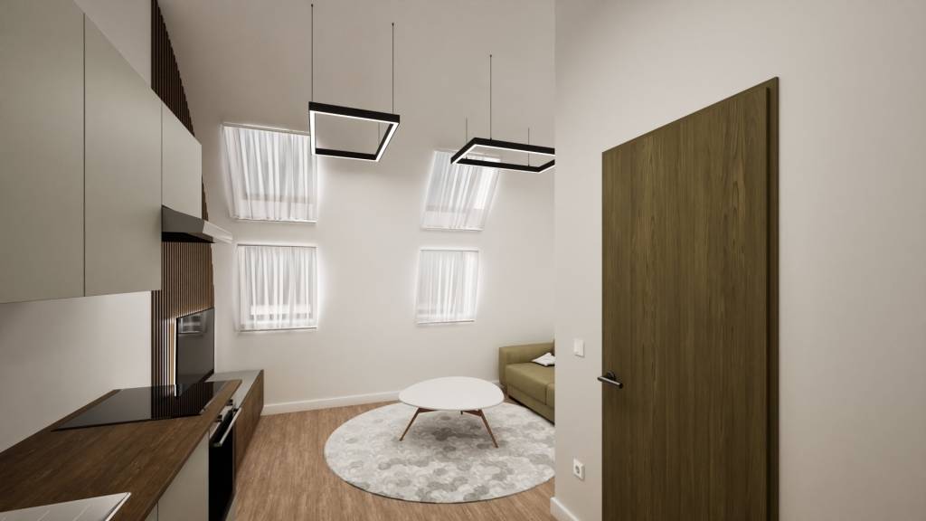 – A tetőtérben a fotókon látható, jelenlegi egy légterű tágas térben további 6+1 db új lakás kerül kialakításra.
