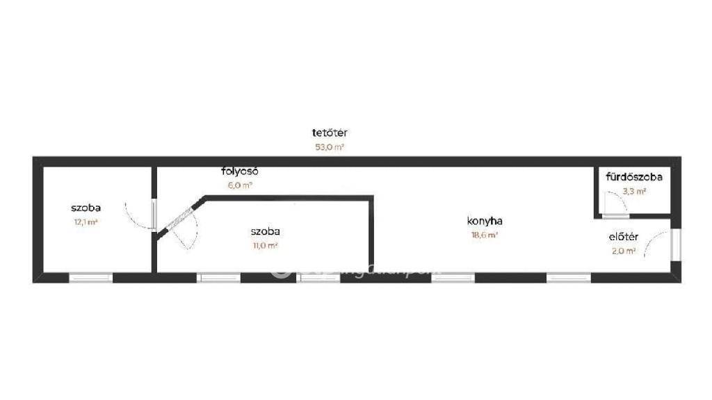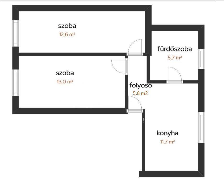 2 szoba, 1 közlekedő, 1 konyha, 1 fürdőszoba alkotja.