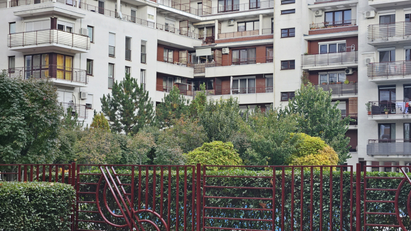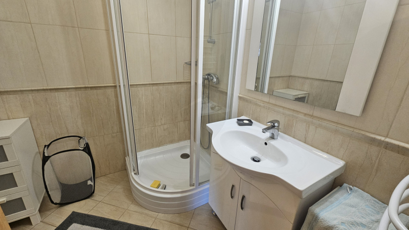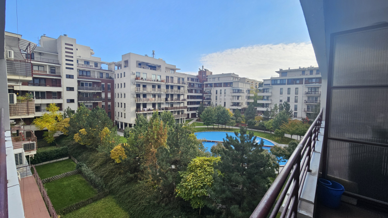 Az erkély és az ablakok csendes zöld parkra néznek. A lakás klimatizált. A fürdőben zuhanyzó van, a wc külön helyiségben.