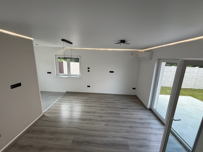 Magas kerítéssel körbekerített saját kerttel rendelkezik ( burkolt terasz kb 12nm + 180nm füvesített kert ), ami intim és biztonságos.