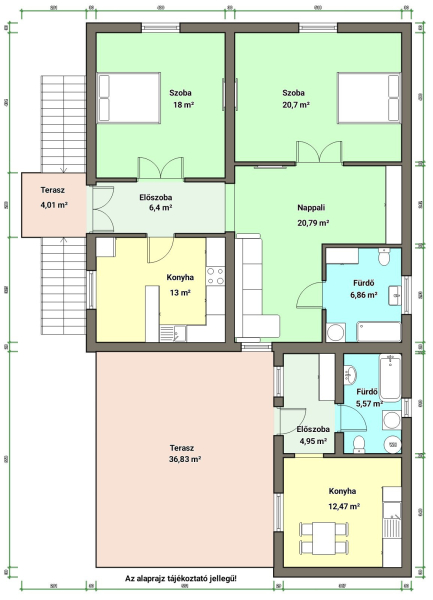 A szuterén rész + hozzáépítés 45 m2-es, 2 szobával, konyhával, előszobával és fürdőszobával rendelkezik.