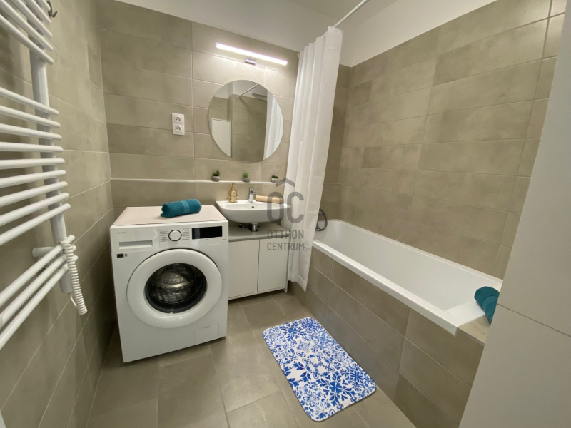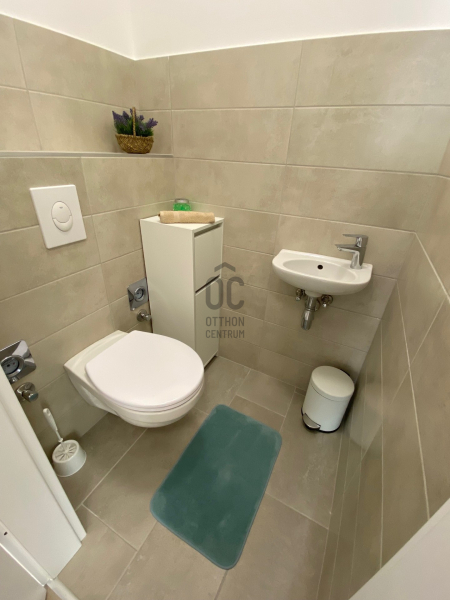 A fürdőszoba modern burkolatokkal és kialakítással készült, a WC külön helyiségben található, tovább növelve a lakás praktikumát.