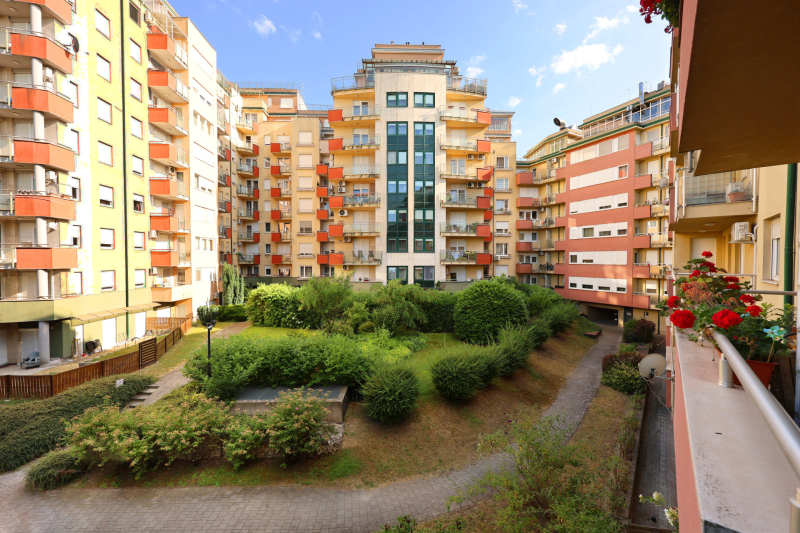 -a lakás erkélye a belső, rendezett udvarra néz,csendes.