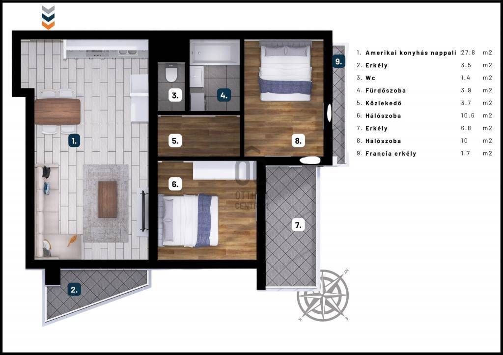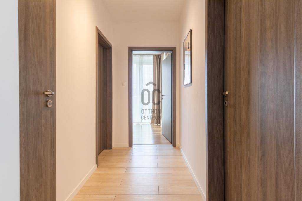 Felosztása: amerikai konyhás nappali és étkező erkély kapcsolattal, hálószoba és dolgozószoba erkély kapcsolattal, kádas fürdőszoba, külön WC, közlekedő.