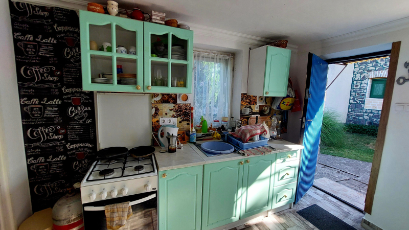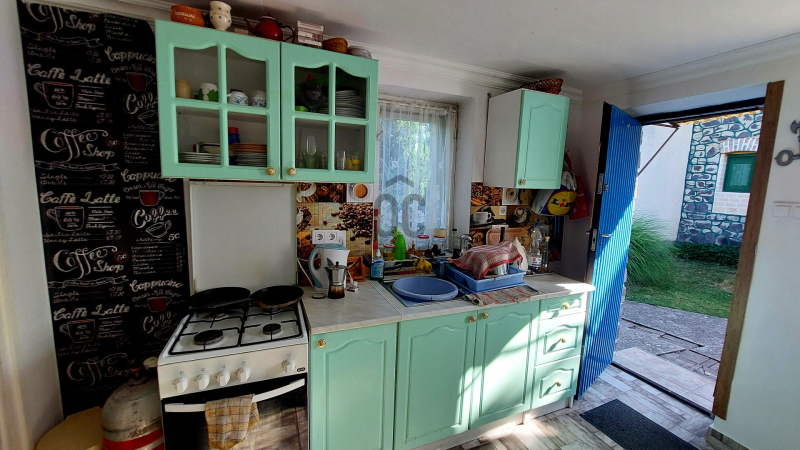 A főépületben egy tágas szoba, egy előtér és egy fürdőszoba található. A konyha és a félszoba a telken található külön kis épületben kapott helyet.
