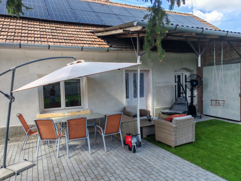 A tető cserép héjazatú, 2 éve lett felújítva, 1 éve pedig egy 12,3 KWP-es, éves szaldós elszámolású napelem került kiépítésre.