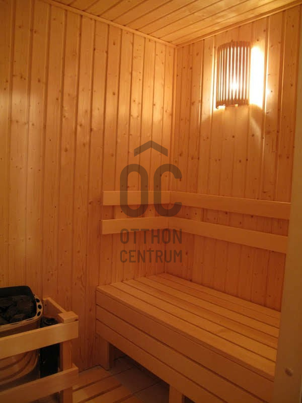 Az alsó szinten beépítésre került egy finn szauna. Ezen a szinten található jelenleg közösségi térként használt helyiség igény esetén átalakítható akár konditeremmé, de vállalkozás folytatásához is tökéletes, hiszen teljesen leválasztható a ház többi részétől.