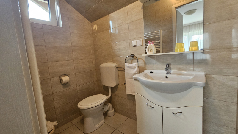 Tulajdonosi lakrész: kb. 100 m²-es, 2 szobával, amerikai konyhás nappalival, kamrával, fürdőszobával (kád és zuhany is), külön WC-vel