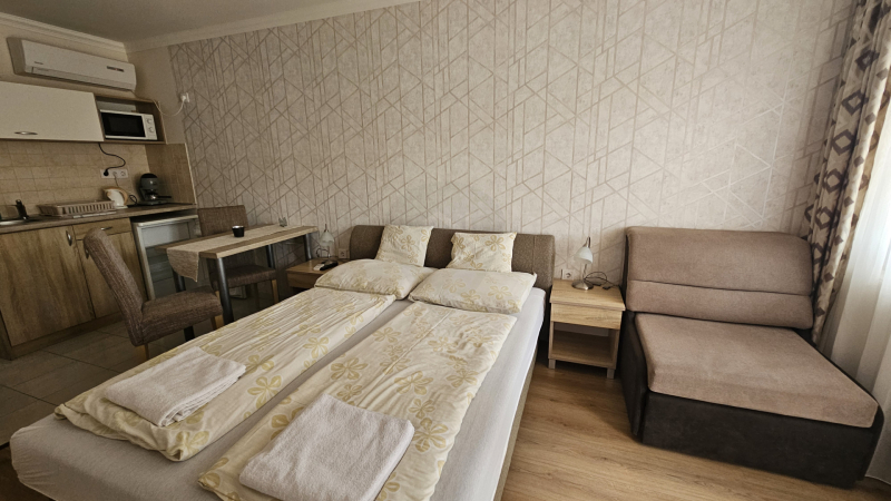 9 különálló apartman, mindegyikben saját konyha és zuhanyzós fürdőszoba, ízlésesen bútorozott, azonnal kiadható állapotban