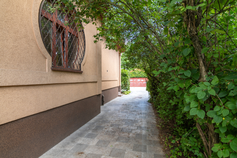 A nagykaputól a garázsig …. Burkolat vezet, a garázs 2 állásos, de tároló polcok is kényelmesen elférnek benne, összesen 38 nm.