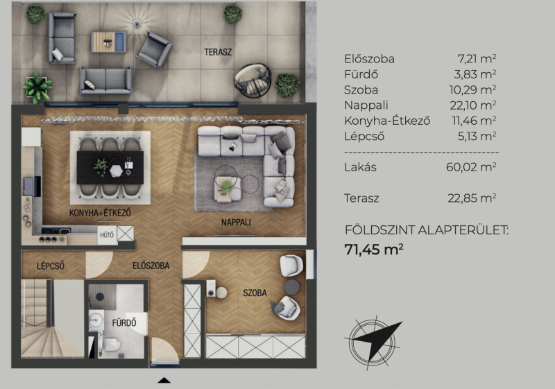 Alapterület: 121,85 m² (Földszint: 71,45 m² + Emelet: 50,40 m²)