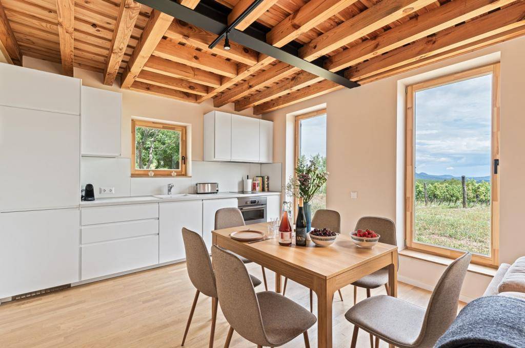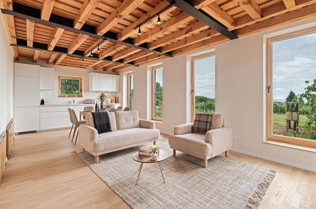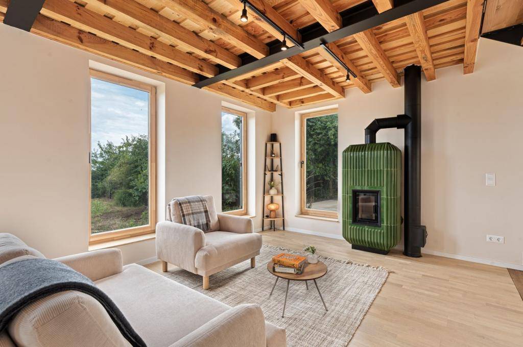 A ház már az első pillanatban megérint – természetes anyagok, meleg tónusok, gondosan megkomponált enteriőrök és okos, fenntartható technológia ötvöződik benne. A kézzel gyártott, tömörfa bútorok, a gyapjúszőnyegek és a díjnyertes Laufer designer cserépkályha nemcsak esztétikai élményt nyújtanak, de valódi otthonérzetet is. A konyha teljesen felszerelt, a fürdőszobában küszöb nélküli walk-in zuhany, motoros tetőablak és Grohe szaniterek teszik még kényelmesebbé a mindennapokat.
