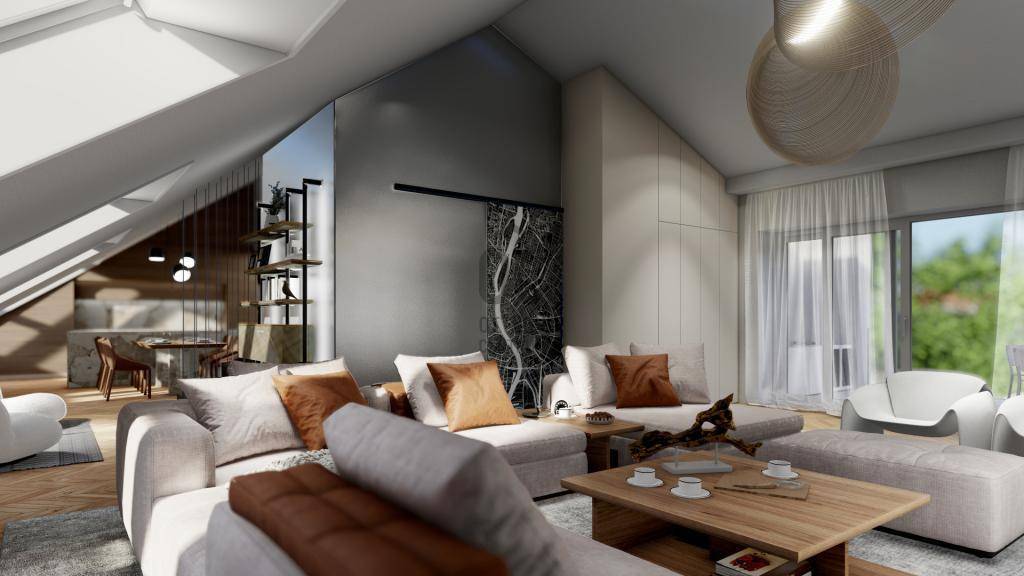 A lakás belső tervezését neves építész- és belsőépítész szakemberek álmodták meg: a magas belmagasság, a letisztult, átlátható terek, valamint a két tágas, összesen 27 m²-es terasz – melyek közül az egyik akár BBQ-teraszként is használható – egyedülállóvá teszik ezt az otthont. Különlegessége, hogy saját lépcsőházzal és két külön bejárattal rendelkezik, így ideális akár vendégrész, akár dolgozószoba kialakítására is.
