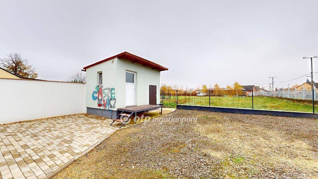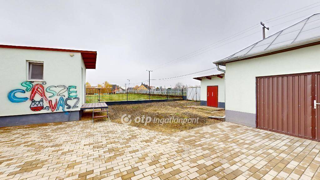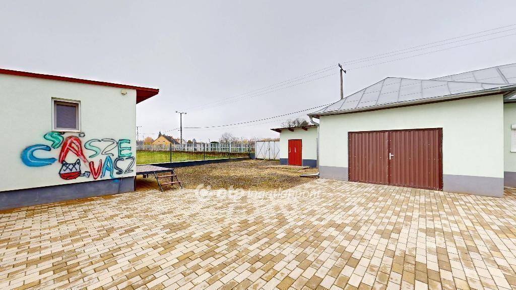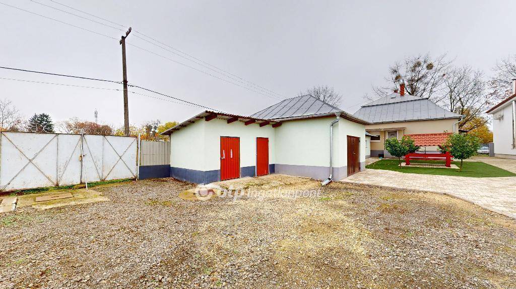 Az épület végében egy zárt garázs található, amely az udvar és az utca felől is ajtóval rendelkezik.