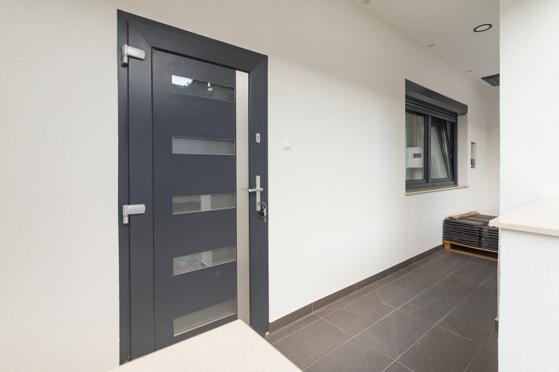 A külső nyílászárók műanyag tok- és szárnyszerkezetű ablakok, 3 rtg. üvegezéssel, redőnnyel felszerelve, a bejárati ajtó 3 ponton záródó biztonsági ajtó, a beltéri ajtók prémium minőségű ajtók.