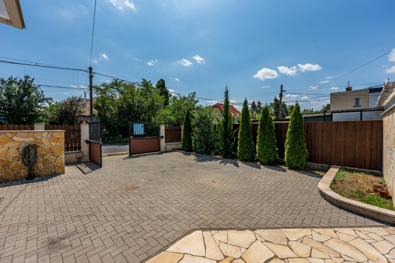 - Viacolorral borított telkére, elektromos kapun keresztül jutunk be, de közvetlen az utcáról a garázsba is be lehet állni, ahonnan rögtön átjárás biztosított a lakóingatlanba.