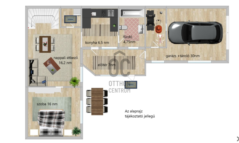 - Földszinten: 2 szoba (16nm, 15,2nm), konyha 6,5 nm, fürdőszoba 4,75nm, garázs+ kamra 30nm, előszoba 7nm