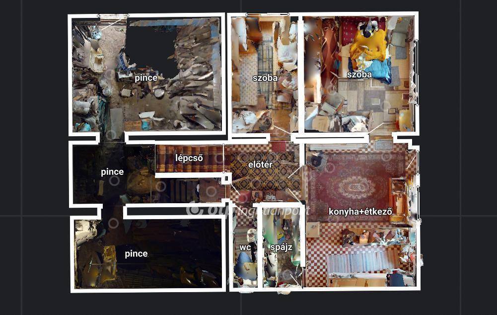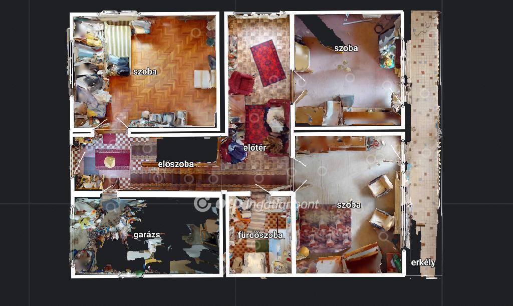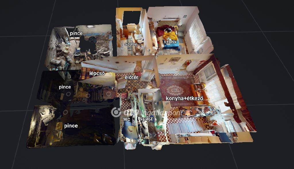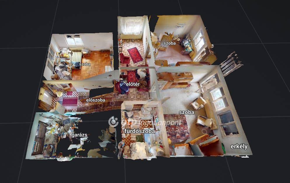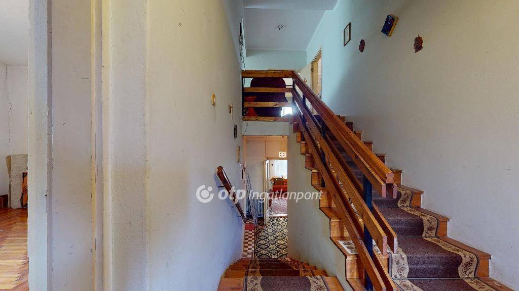 Az ingatlan alsó szintjén egy szoba, egy fél szoba, étkező + konyha, spájz, és külön WC helyiségek találhatóak. Az étkezőből egy fedett taraszon keresztül közvetlenül megközelíthető az udvar. A nappali parkettával, a többi helyiség járólappal fedett. A földszinten található egy teljesértékű szoba, valamint a garázs, ahonnan egyenesen a lakótérbe jutunk.