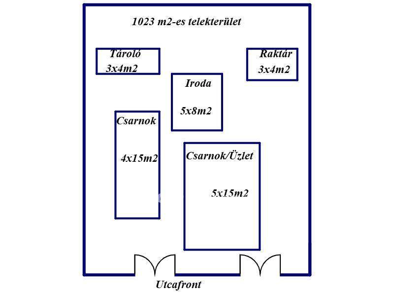 1023 m2-es nagyságú telekterületen, csarnok, raktárhelyiségek, üzlethelyiség, iroda épület került elhelyezésre.