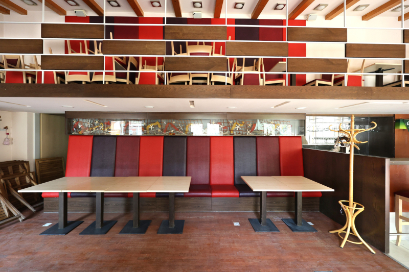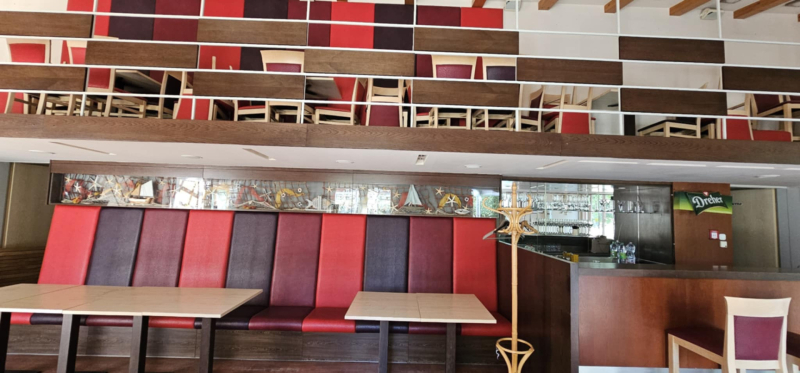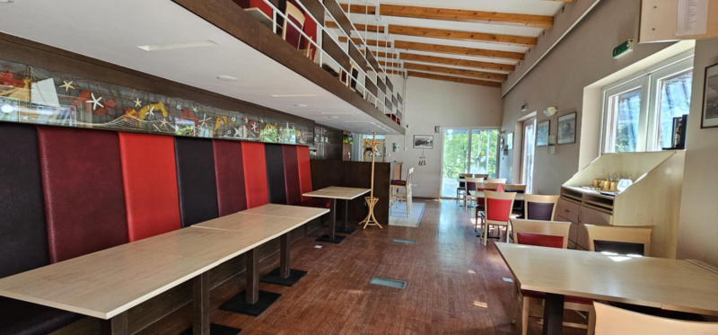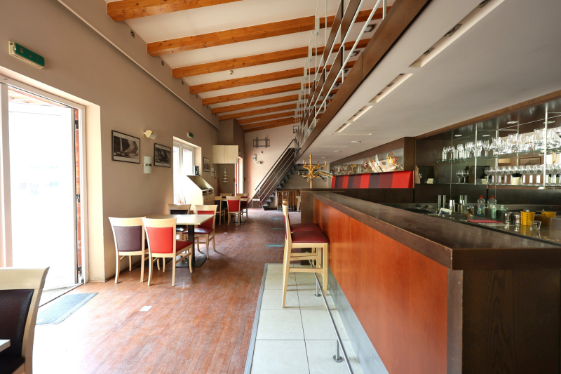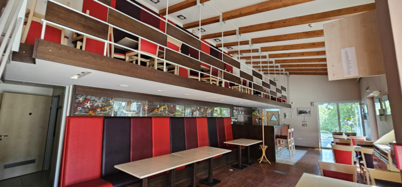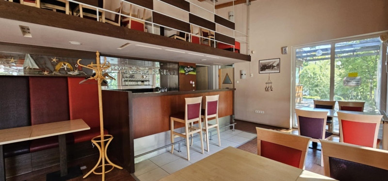 A vendéglátó egység tágas galériás vendégtérrel rendelkezik melyhez összességében 204 nm-es terasz tartozik, melyet akár igény szerint be is lehetne építeni.