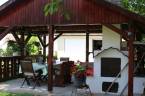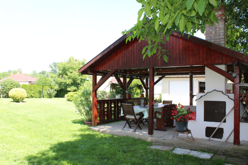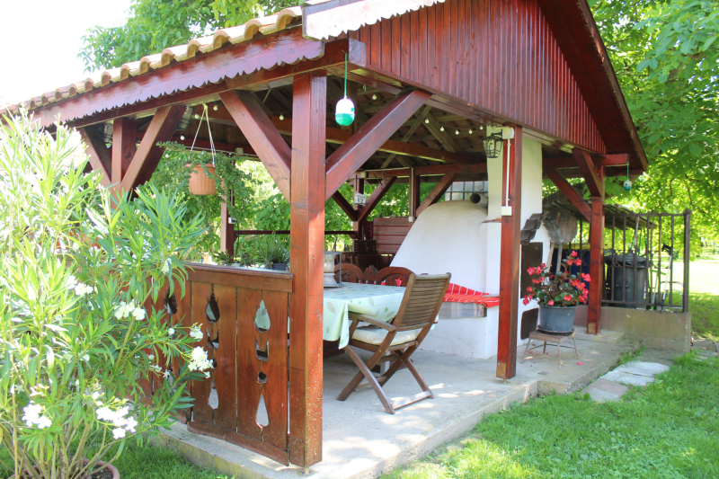 A három épület ölelésében egy filagória kapott helyet egy hatalmas diófa árnyékában és amelyben egy kemence is szelíden megbújik, mégis ékeként az építménynek!
