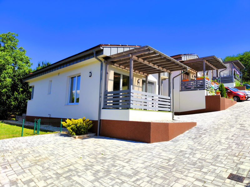 Hévíz zöldövezeti csendes részén található ez a dombos délkeleti fekvésű panorámás telek, ezen épült a három, 75 m2 hasznos alapterületű, egyszintes lakóépület. A hozzá tartozó udvarrészben kerti tároló is helyet kapott.