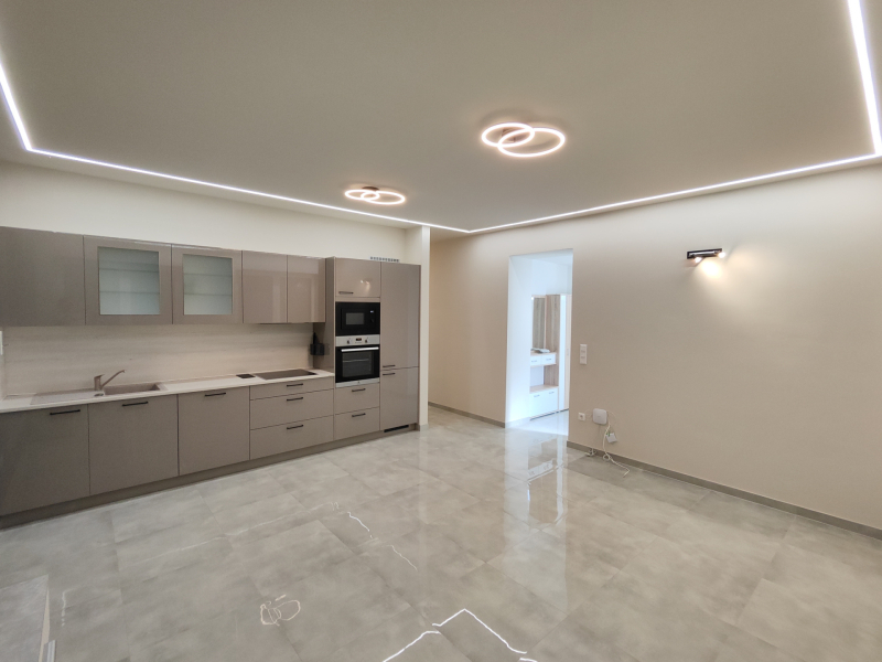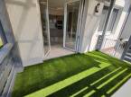 A nagy nappalihoz kertkapcsolatos épített terasz tartozik, zöld területtel, automata locsolórendszerrel.