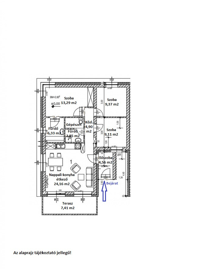 előszoba, nappali – étkező – konyha, háztartási helyiség, zuhanyzó/WC, közlekedő, 3 db hálószoba, fürdőkádas fürdőszoba WC-vel.