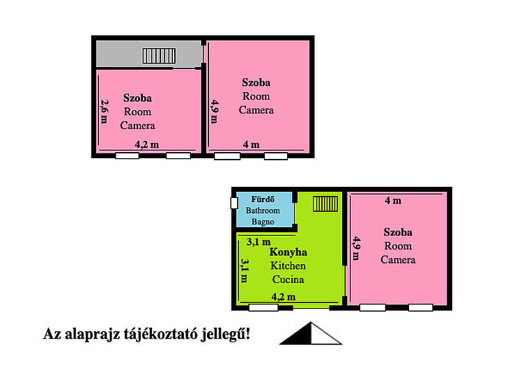 Tulajdoni lap szerint 40 m2-es a lakás, viszont a belmagasságot kihasználva, egy felső szint lett kialakítva, így a felhasználható hasznos terület 75 m2, ügyvédi használati megosztási szerződéssel rendelkező ingatlan. Alsó szinten a belmagasság 230 cm, a felső szinten pedig 195 cm.