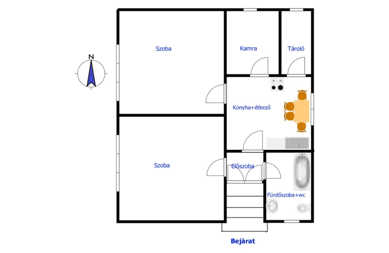 Az 558 m2-es telken fekvő 55,38 m2-es épületben található előszoba, 2 szoba, fürdőszoba egyben wc-vel, egy étkezős konyha, egy spájz és egy tároló helység.