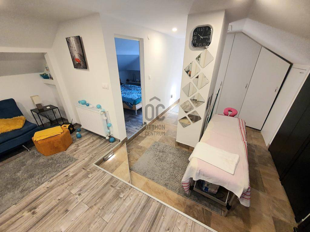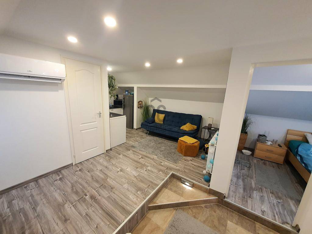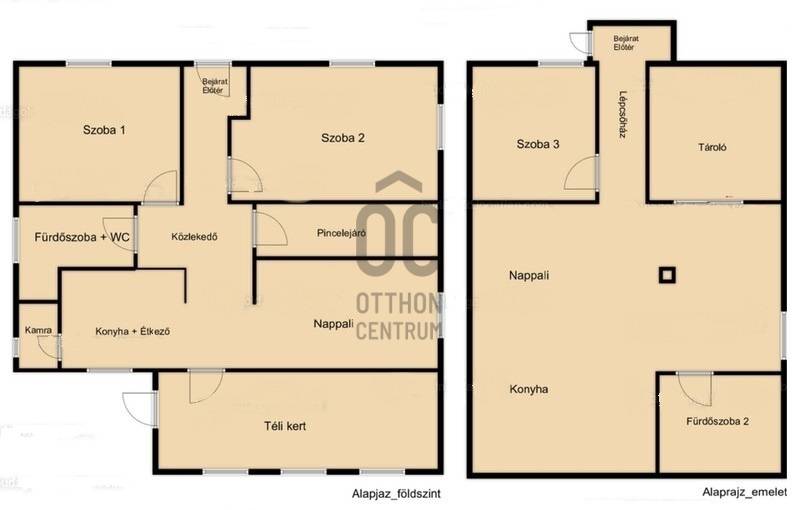 -Emelet: közlekedő, szoba, nappali, konyha, fürdőszoba-wc