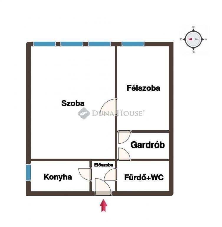 Az ingatlan áll két szobából, előszobából, konyhából, gardróbból és fürdő+WC-ből. A lakás elrendezése kiváló, teljesen körbejárható, így a fürdő is mindkét szobából külön elérhető. A lakóhelyiségek nagy ablakokkal ellátottak, jók a fényviszonyok, a fürdőszoba és az ablakos konyha szellőzővel ellátottak. A többrétegű műanyag ablakok redőnnyel felszereltek, a vezetékek, burkolatok és a beltéri ajtók is felújításra szorulnak, a villanyvezetékek vésés nélkül cserélhetőek.