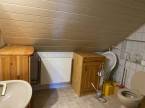 A második szintre feljutva jobbra a fürdőszoba van wc-vel, továbbhaladva fa konyhabútorral beépített amerika konyha található kis kamrával, valamint nappali hálószobával.